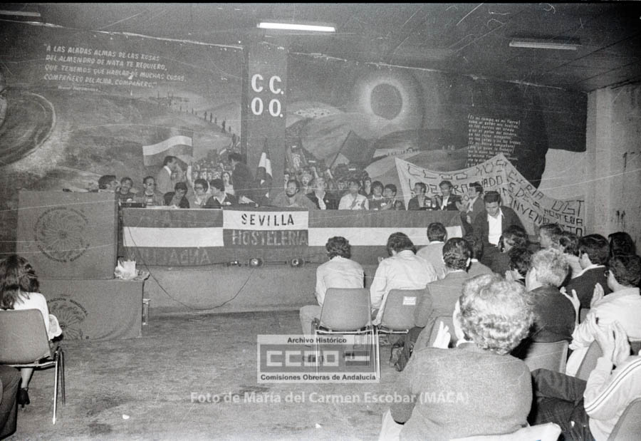 María del Carmen Escobar, MACA, nació en Ayamonte (Huelva) el 5 de diciembre de 1952. Siendo niña su familia fijó la residencia en Sevilla, ciudad en la que viviría el resto de su vida. En 1969 comenzó a trabajar en el Galerías Preciados, donde comenzó su actividad sindical. En 1976 ingresa en las aún clandestinas CCOO de Sevilla. Tras la legalización del sindicato, en abril de 1977, fue contratada por la Unión Provincial de Sevilla. Sus reportajes fotográficos enriquecieron Realidad, periódico emblemático de las CCOO de Sevilla, así como otros órganos de expresión del sindicato. Tanto los conflictos laborales, como la frenética actividad que desarrollaron los movimientos sociales durante los años de la Transición fueron recogidos por la cámara de Maca, por lo que su obra constituye un indispensable repositorio de la memoria gráfica obrera y militante de esos años. Mostró especial interés en fotografiar los actos promovidos por el incipiente movimiento feminista, así como, por destacar la participación de las mujeres en la vida pública. Desde entonces y hasta su temprana muerte en abril de 2013, Maca trabajó para CCOO y para otras entidades, como RTVA, manteniendo siempre un fuerte compromiso con la clase trabajadora. Su fondo fotográfico, formado por más de 20.000 negativos, se conserva en el Archivo Histórico de CCOO de Andalucía y está disponible para su consulta pública