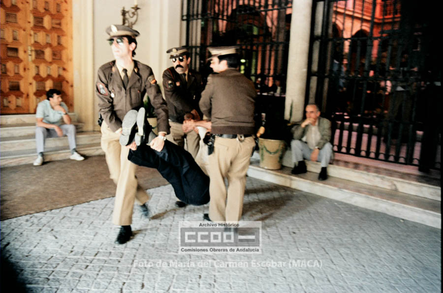 María del Carmen Escobar, MACA, nació en Ayamonte (Huelva) el 5 de diciembre de 1952. Siendo niña su familia fijó la residencia en Sevilla, ciudad en la que viviría el resto de su vida. En 1969 comenzó a trabajar en el Galerías Preciados, donde comenzó su actividad sindical. En 1976 ingresa en las aún clandestinas CCOO de Sevilla. Tras la legalización del sindicato, en abril de 1977, fue contratada por la Unión Provincial de Sevilla. Sus reportajes fotográficos enriquecieron Realidad, periódico emblemático de las CCOO de Sevilla, así como otros órganos de expresión del sindicato. Tanto los conflictos laborales, como la frenética actividad que desarrollaron los movimientos sociales durante los años de la Transición fueron recogidos por la cámara de Maca, por lo que su obra constituye un indispensable repositorio de la memoria gráfica obrera y militante de esos años. Mostró especial interés en fotografiar los actos promovidos por el incipiente movimiento feminista, así como, por destacar la participación de las mujeres en la vida pública. Desde entonces y hasta su temprana muerte en abril de 2013, Maca trabajó para CCOO y para otras entidades, como RTVA, manteniendo siempre un fuerte compromiso con la clase trabajadora. Su fondo fotográfico, formado por más de 20.000 negativos, se conserva en el Archivo Histórico de CCOO de Andalucía y está disponible para su consulta pública