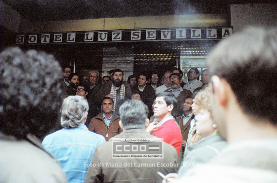 María del Carmen Escobar, MACA, nació en Ayamonte (Huelva) el 5 de diciembre de 1952. Siendo niña su familia fijó la residencia en Sevilla, ciudad en la que viviría el resto de su vida. En 1969 comenzó a trabajar en el Galerías Preciados, donde comenzó su actividad sindical. En 1976 ingresa en las aún clandestinas CCOO de Sevilla. Tras la legalización del sindicato, en abril de 1977, fue contratada por la Unión Provincial de Sevilla. Sus reportajes fotográficos enriquecieron Realidad, periódico emblemático de las CCOO de Sevilla, así como otros órganos de expresión del sindicato. Tanto los conflictos laborales, como la frenética actividad que desarrollaron los movimientos sociales durante los años de la Transición fueron recogidos por la cámara de Maca, por lo que su obra constituye un indispensable repositorio de la memoria gráfica obrera y militante de esos años. Mostró especial interés en fotografiar los actos promovidos por el incipiente movimiento feminista, así como, por destacar la participación de las mujeres en la vida pública. Desde entonces y hasta su temprana muerte en abril de 2013, Maca trabajó para CCOO y para otras entidades, como RTVA, manteniendo siempre un fuerte compromiso con la clase trabajadora. Su fondo fotográfico, formado por más de 20.000 negativos, se conserva en el Archivo Histórico de CCOO de Andalucía y está disponible para su consulta pública