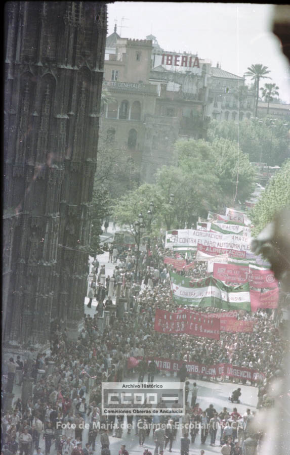 María del Carmen Escobar, MACA, nació en Ayamonte (Huelva) el 5 de diciembre de 1952. Siendo niña su familia fijó la residencia en Sevilla, ciudad en la que viviría el resto de su vida. En 1969 comenzó a trabajar en el Galerías Preciados, donde comenzó su actividad sindical. En 1976 ingresa en las aún clandestinas CCOO de Sevilla. Tras la legalización del sindicato, en abril de 1977, fue contratada por la Unión Provincial de Sevilla. Sus reportajes fotográficos enriquecieron Realidad, periódico emblemático de las CCOO de Sevilla, así como otros órganos de expresión del sindicato. Tanto los conflictos laborales, como la frenética actividad que desarrollaron los movimientos sociales durante los años de la Transición fueron recogidos por la cámara de Maca, por lo que su obra constituye un indispensable repositorio de la memoria gráfica obrera y militante de esos años. Mostró especial interés en fotografiar los actos promovidos por el incipiente movimiento feminista, así como, por destacar la participación de las mujeres en la vida pública. Desde entonces y hasta su temprana muerte en abril de 2013, Maca trabajó para CCOO y para otras entidades, como RTVA, manteniendo siempre un fuerte compromiso con la clase trabajadora. Su fondo fotográfico, formado por más de 20.000 negativos, se conserva en el Archivo Histórico de CCOO de Andalucía y está disponible para su consulta pública
