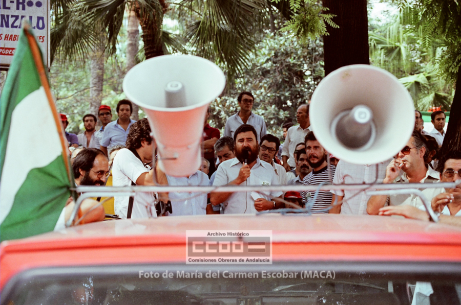 María del Carmen Escobar, MACA, nació en Ayamonte (Huelva) el 5 de diciembre de 1952. Siendo niña su familia fijó la residencia en Sevilla, ciudad en la que viviría el resto de su vida. En 1969 comenzó a trabajar en el Galerías Preciados, donde comenzó su actividad sindical. En 1976 ingresa en las aún clandestinas CCOO de Sevilla. Tras la legalización del sindicato, en abril de 1977, fue contratada por la Unión Provincial de Sevilla. Sus reportajes fotográficos enriquecieron Realidad, periódico emblemático de las CCOO de Sevilla, así como otros órganos de expresión del sindicato. Tanto los conflictos laborales, como la frenética actividad que desarrollaron los movimientos sociales durante los años de la Transición fueron recogidos por la cámara de Maca, por lo que su obra constituye un indispensable repositorio de la memoria gráfica obrera y militante de esos años. Mostró especial interés en fotografiar los actos promovidos por el incipiente movimiento feminista, así como, por destacar la participación de las mujeres en la vida pública. Desde entonces y hasta su temprana muerte en abril de 2013, Maca trabajó para CCOO y para otras entidades, como RTVA, manteniendo siempre un fuerte compromiso con la clase trabajadora. Su fondo fotográfico, formado por más de 20.000 negativos, se conserva en el Archivo Histórico de CCOO de Andalucía y está disponible para su consulta pública