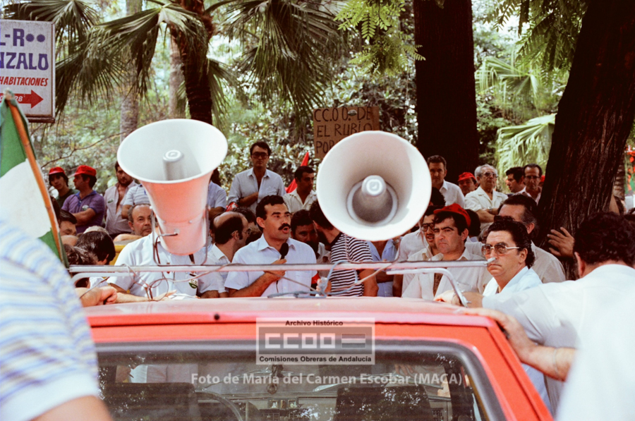 María del Carmen Escobar, MACA, nació en Ayamonte (Huelva) el 5 de diciembre de 1952. Siendo niña su familia fijó la residencia en Sevilla, ciudad en la que viviría el resto de su vida. En 1969 comenzó a trabajar en el Galerías Preciados, donde comenzó su actividad sindical. En 1976 ingresa en las aún clandestinas CCOO de Sevilla. Tras la legalización del sindicato, en abril de 1977, fue contratada por la Unión Provincial de Sevilla. Sus reportajes fotográficos enriquecieron Realidad, periódico emblemático de las CCOO de Sevilla, así como otros órganos de expresión del sindicato. Tanto los conflictos laborales, como la frenética actividad que desarrollaron los movimientos sociales durante los años de la Transición fueron recogidos por la cámara de Maca, por lo que su obra constituye un indispensable repositorio de la memoria gráfica obrera y militante de esos años. Mostró especial interés en fotografiar los actos promovidos por el incipiente movimiento feminista, así como, por destacar la participación de las mujeres en la vida pública. Desde entonces y hasta su temprana muerte en abril de 2013, Maca trabajó para CCOO y para otras entidades, como RTVA, manteniendo siempre un fuerte compromiso con la clase trabajadora. Su fondo fotográfico, formado por más de 20.000 negativos, se conserva en el Archivo Histórico de CCOO de Andalucía y está disponible para su consulta pública