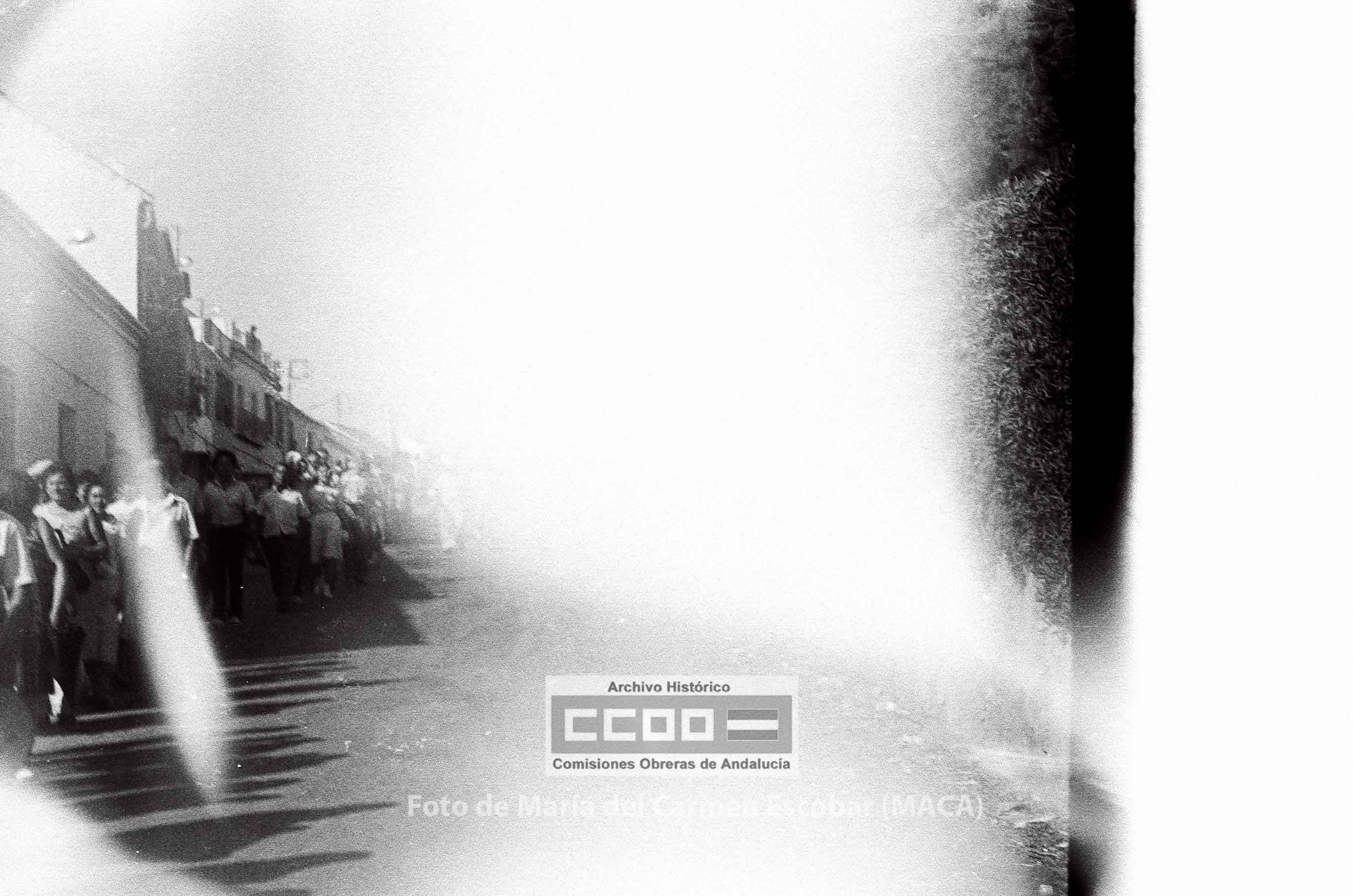 María del Carmen Escobar, MACA, nació en Ayamonte (Huelva) el 5 de diciembre de 1952. Siendo niña su familia fijó la residencia en Sevilla, ciudad en la que viviría el resto de su vida. En 1969 comenzó a trabajar en el Galerías Preciados, donde comenzó su actividad sindical. En 1976 ingresa en las aún clandestinas CCOO de Sevilla. Tras la legalización del sindicato, en abril de 1977, fue contratada por la Unión Provincial de Sevilla. Sus reportajes fotográficos enriquecieron Realidad, periódico emblemático de las CCOO de Sevilla, así como otros órganos de expresión del sindicato. Tanto los conflictos laborales, como la frenética actividad que desarrollaron los movimientos sociales durante los años de la Transición fueron recogidos por la cámara de Maca, por lo que su obra constituye un indispensable repositorio de la memoria gráfica obrera y militante de esos años. Mostró especial interés en fotografiar los actos promovidos por el incipiente movimiento feminista, así como, por destacar la participación de las mujeres en la vida pública. Desde entonces y hasta su temprana muerte en abril de 2013, Maca trabajó para CCOO y para otras entidades, como RTVA, manteniendo siempre un fuerte compromiso con la clase trabajadora. Su fondo fotográfico, formado por más de 20.000 negativos, se conserva en el Archivo Histórico de CCOO de Andalucía y está disponible para su consulta pública
