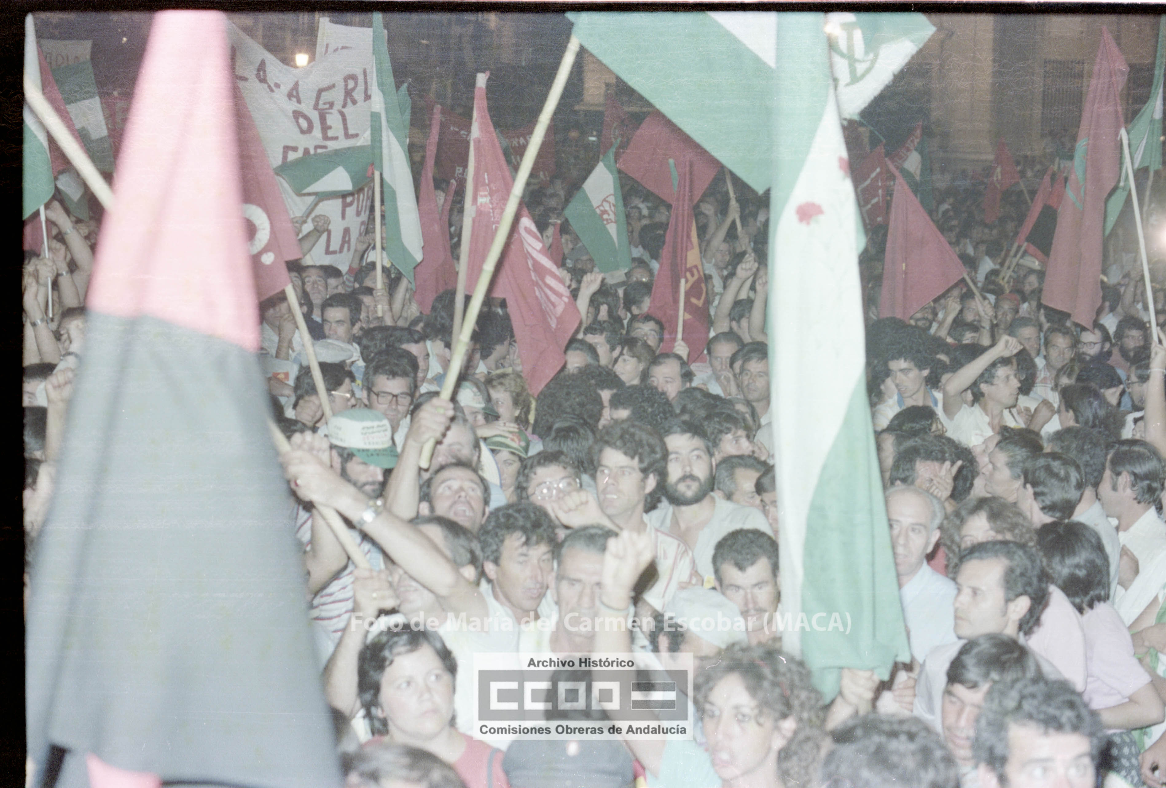 María del Carmen Escobar, MACA, nació en Ayamonte (Huelva) el 5 de diciembre de 1952. Siendo niña su familia fijó la residencia en Sevilla, ciudad en la que viviría el resto de su vida. En 1969 comenzó a trabajar en el Galerías Preciados, donde comenzó su actividad sindical. En 1976 ingresa en las aún clandestinas CCOO de Sevilla. Tras la legalización del sindicato, en abril de 1977, fue contratada por la Unión Provincial de Sevilla. Sus reportajes fotográficos enriquecieron Realidad, periódico emblemático de las CCOO de Sevilla, así como otros órganos de expresión del sindicato. Tanto los conflictos laborales, como la frenética actividad que desarrollaron los movimientos sociales durante los años de la Transición fueron recogidos por la cámara de Maca, por lo que su obra constituye un indispensable repositorio de la memoria gráfica obrera y militante de esos años. Mostró especial interés en fotografiar los actos promovidos por el incipiente movimiento feminista, así como, por destacar la participación de las mujeres en la vida pública. Desde entonces y hasta su temprana muerte en abril de 2013, Maca trabajó para CCOO y para otras entidades, como RTVA, manteniendo siempre un fuerte compromiso con la clase trabajadora. Su fondo fotográfico, formado por más de 20.000 negativos, se conserva en el Archivo Histórico de CCOO de Andalucía y está disponible para su consulta pública