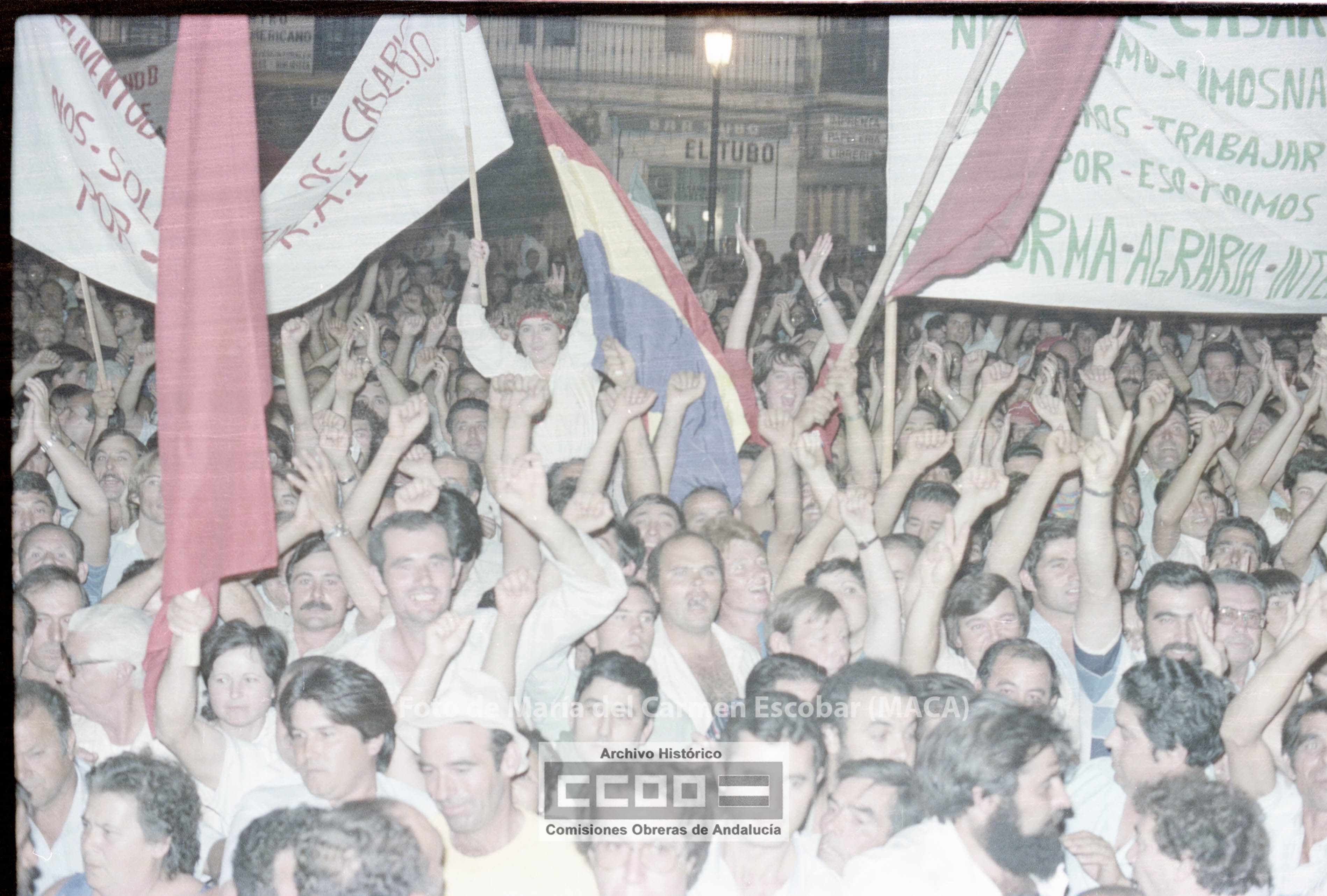 María del Carmen Escobar, MACA, nació en Ayamonte (Huelva) el 5 de diciembre de 1952. Siendo niña su familia fijó la residencia en Sevilla, ciudad en la que viviría el resto de su vida. En 1969 comenzó a trabajar en el Galerías Preciados, donde comenzó su actividad sindical. En 1976 ingresa en las aún clandestinas CCOO de Sevilla. Tras la legalización del sindicato, en abril de 1977, fue contratada por la Unión Provincial de Sevilla. Sus reportajes fotográficos enriquecieron Realidad, periódico emblemático de las CCOO de Sevilla, así como otros órganos de expresión del sindicato. Tanto los conflictos laborales, como la frenética actividad que desarrollaron los movimientos sociales durante los años de la Transición fueron recogidos por la cámara de Maca, por lo que su obra constituye un indispensable repositorio de la memoria gráfica obrera y militante de esos años. Mostró especial interés en fotografiar los actos promovidos por el incipiente movimiento feminista, así como, por destacar la participación de las mujeres en la vida pública. Desde entonces y hasta su temprana muerte en abril de 2013, Maca trabajó para CCOO y para otras entidades, como RTVA, manteniendo siempre un fuerte compromiso con la clase trabajadora. Su fondo fotográfico, formado por más de 20.000 negativos, se conserva en el Archivo Histórico de CCOO de Andalucía y está disponible para su consulta pública