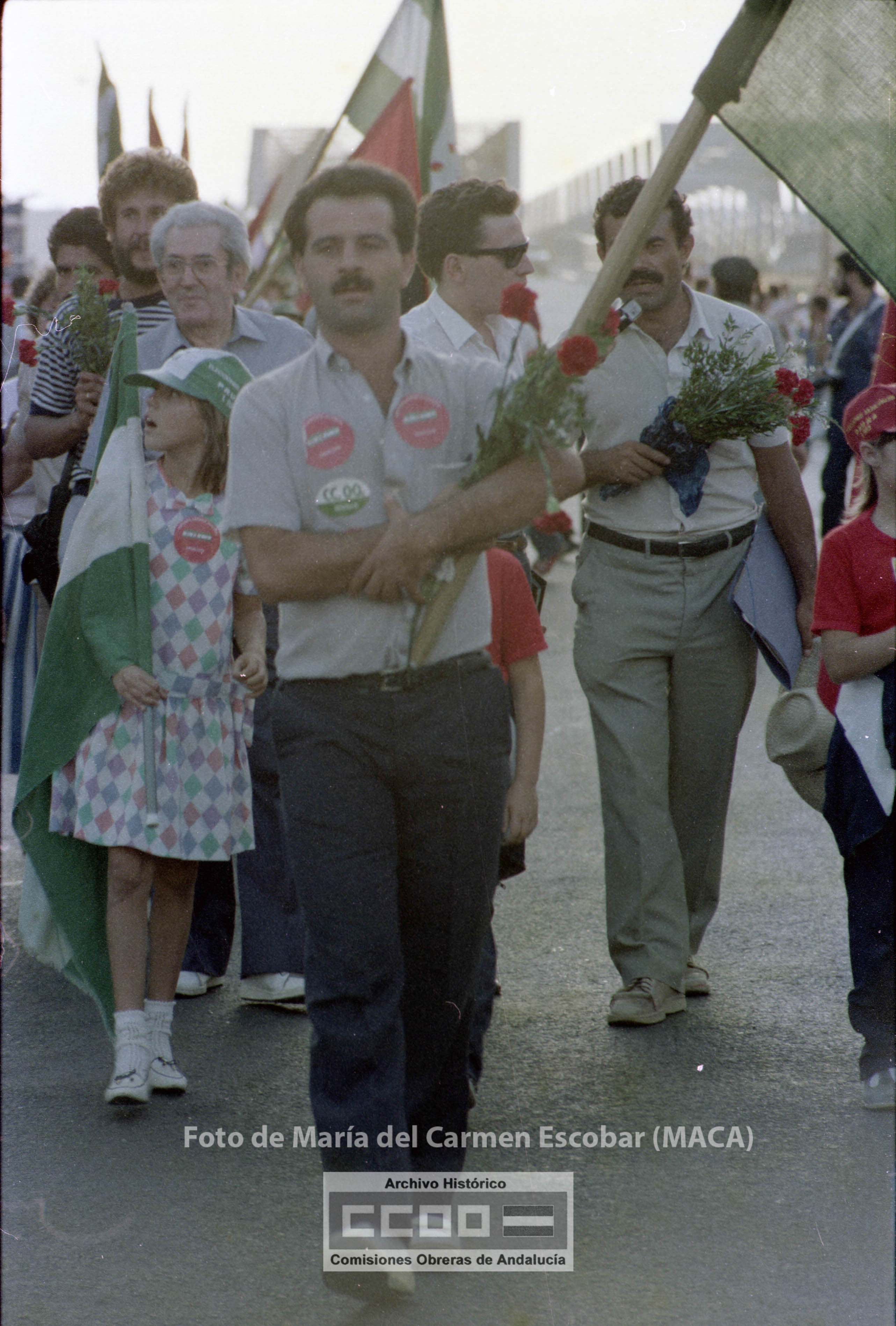 María del Carmen Escobar, MACA, nació en Ayamonte (Huelva) el 5 de diciembre de 1952. Siendo niña su familia fijó la residencia en Sevilla, ciudad en la que viviría el resto de su vida. En 1969 comenzó a trabajar en el Galerías Preciados, donde comenzó su actividad sindical. En 1976 ingresa en las aún clandestinas CCOO de Sevilla. Tras la legalización del sindicato, en abril de 1977, fue contratada por la Unión Provincial de Sevilla. Sus reportajes fotográficos enriquecieron Realidad, periódico emblemático de las CCOO de Sevilla, así como otros órganos de expresión del sindicato. Tanto los conflictos laborales, como la frenética actividad que desarrollaron los movimientos sociales durante los años de la Transición fueron recogidos por la cámara de Maca, por lo que su obra constituye un indispensable repositorio de la memoria gráfica obrera y militante de esos años. Mostró especial interés en fotografiar los actos promovidos por el incipiente movimiento feminista, así como, por destacar la participación de las mujeres en la vida pública. Desde entonces y hasta su temprana muerte en abril de 2013, Maca trabajó para CCOO y para otras entidades, como RTVA, manteniendo siempre un fuerte compromiso con la clase trabajadora. Su fondo fotográfico, formado por más de 20.000 negativos, se conserva en el Archivo Histórico de CCOO de Andalucía y está disponible para su consulta pública