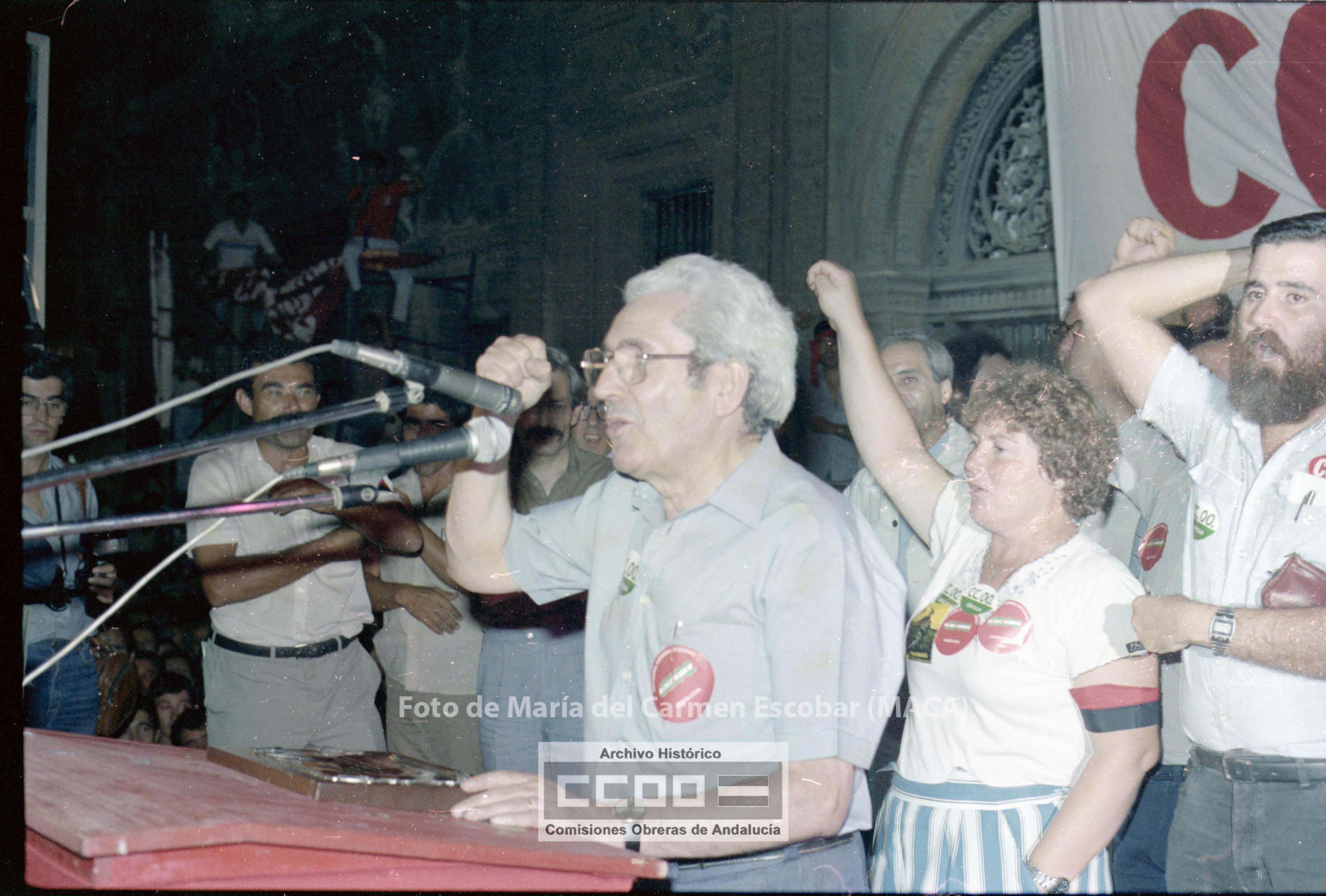 María del Carmen Escobar, MACA, nació en Ayamonte (Huelva) el 5 de diciembre de 1952. Siendo niña su familia fijó la residencia en Sevilla, ciudad en la que viviría el resto de su vida. En 1969 comenzó a trabajar en el Galerías Preciados, donde comenzó su actividad sindical. En 1976 ingresa en las aún clandestinas CCOO de Sevilla. Tras la legalización del sindicato, en abril de 1977, fue contratada por la Unión Provincial de Sevilla. Sus reportajes fotográficos enriquecieron Realidad, periódico emblemático de las CCOO de Sevilla, así como otros órganos de expresión del sindicato. Tanto los conflictos laborales, como la frenética actividad que desarrollaron los movimientos sociales durante los años de la Transición fueron recogidos por la cámara de Maca, por lo que su obra constituye un indispensable repositorio de la memoria gráfica obrera y militante de esos años. Mostró especial interés en fotografiar los actos promovidos por el incipiente movimiento feminista, así como, por destacar la participación de las mujeres en la vida pública. Desde entonces y hasta su temprana muerte en abril de 2013, Maca trabajó para CCOO y para otras entidades, como RTVA, manteniendo siempre un fuerte compromiso con la clase trabajadora. Su fondo fotográfico, formado por más de 20.000 negativos, se conserva en el Archivo Histórico de CCOO de Andalucía y está disponible para su consulta pública
